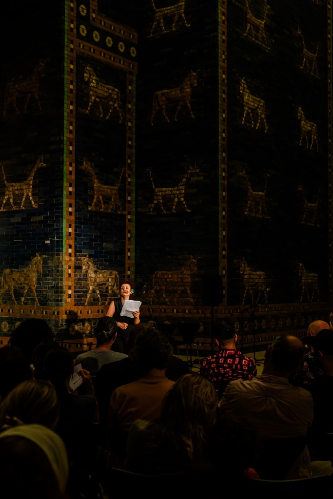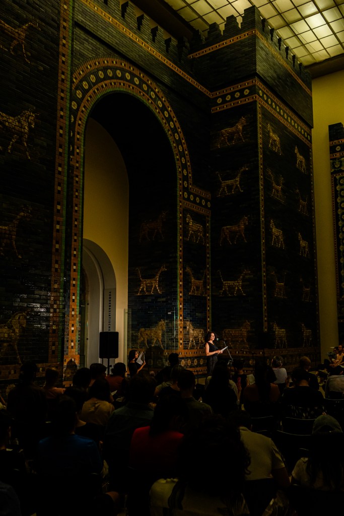 A community event held on August 23, 2023, which invited migrant Middle Eastern artists to reflect on their unique connections to the ancient Babylonian past through original poetry and musical performances in Arabic, Turkish, Kurdish, English, and German. The event was held under the Ishtar Gate in the Berlin’s Pergamon Museum, drew a crowd of over 1,500 people, and was covered in Tagesspiegel in the following article.